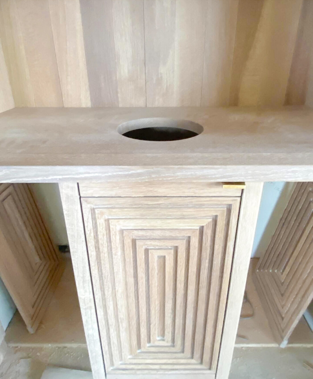 This in-progress installation showcases a fully custom white oak corner cabinet, precision-shaped to wrap around an adjacent built-in. The curved base detail accommodates a stone-clad vertical surface, creating a seamless architectural integration between cabinetry and surrounding structures. This piece demonstrates MDM Design Studio’s ability to