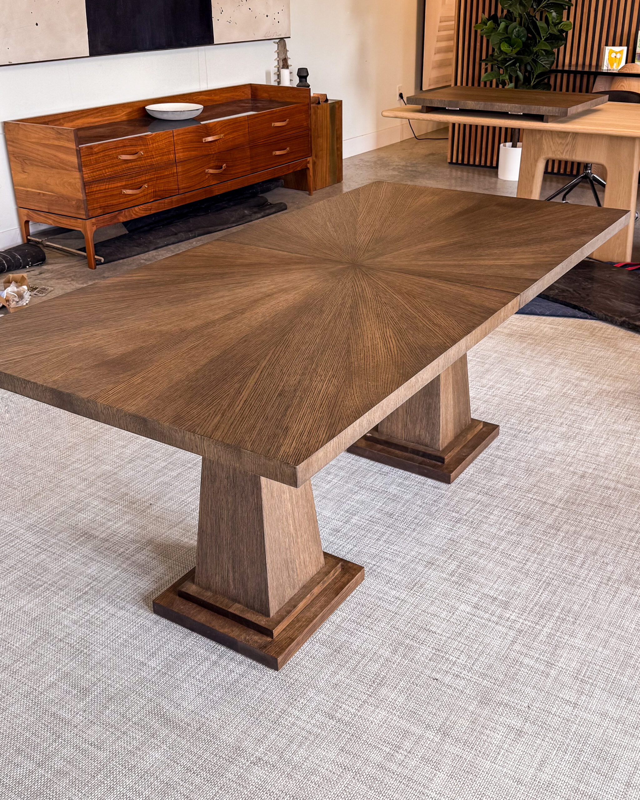This custom dining table blends modern craftsmanship with timeless appeal. The tabletop with Pedestal Bases showcases a stunning radial wood-grain pattern that draws the eye to the center of the piece. The dual plinth-style pedestal bases ground the design, offering both strength and elegant symmetry.