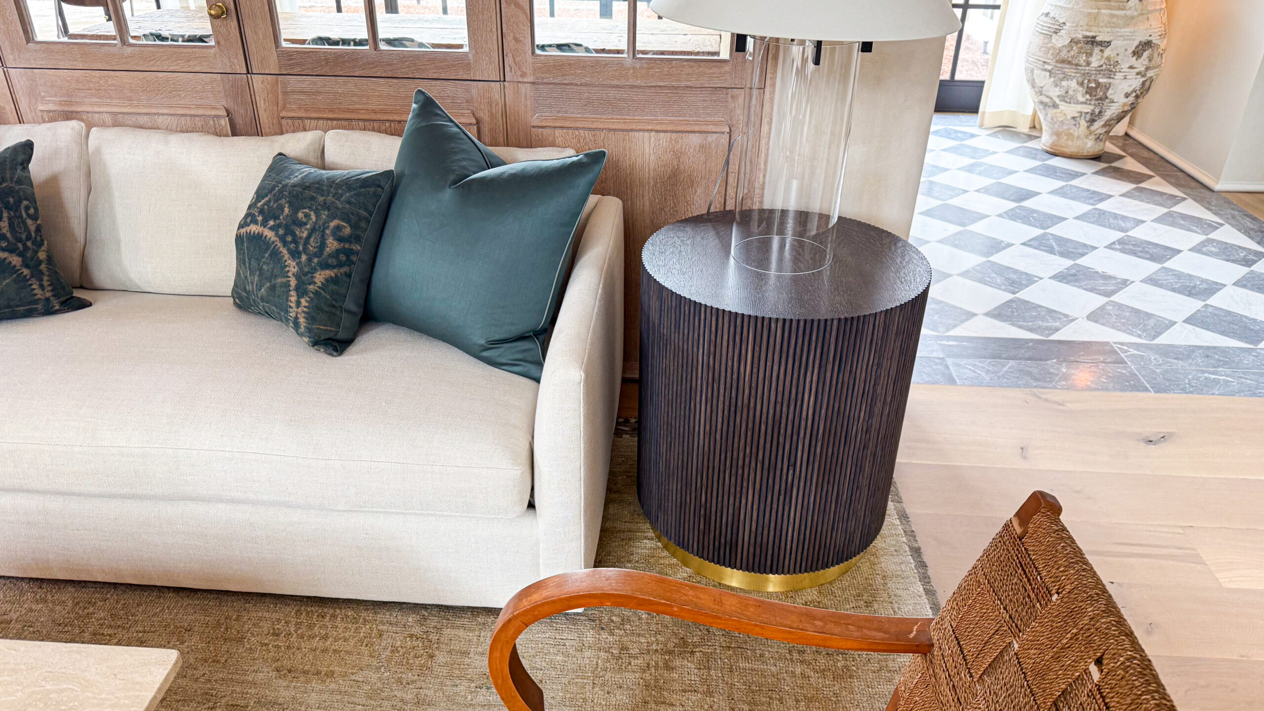 A round side table featuring a vertically fluted dark wood base and a brushed brass plinth. The rich texture of the wood contrasts beautifully with the warm metallic accent, creating a versatile piece that fits equally well in modern or transitional interiors. We worked on this project with Liz Hand Woods.