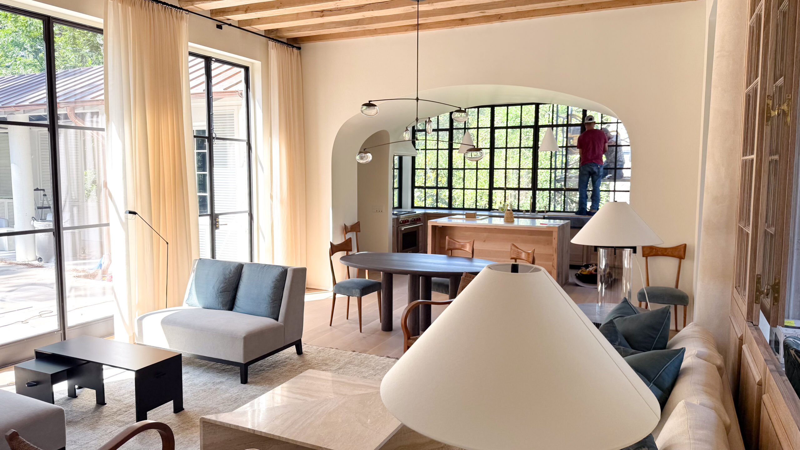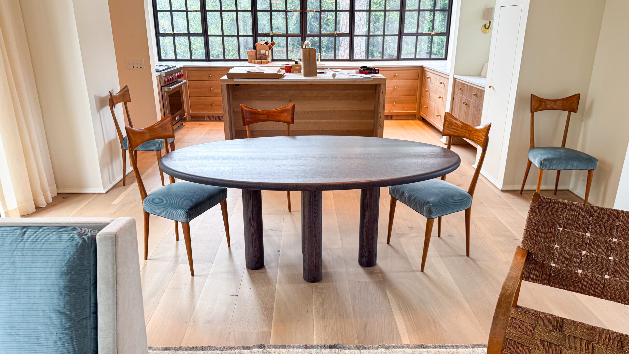 An oval dining table with a smooth, dark wood top supported by bold cylindrical legs. The design’s sculptural base and warm finish make it equally suited for everyday meals or special gatherings. Warm light, natural textures, and handcrafted details come together in this amazing living and dining space. The oak dining table and kitchen island bring a grounded elegance to the modern architecture, balancing clean lines with organic warmth.
