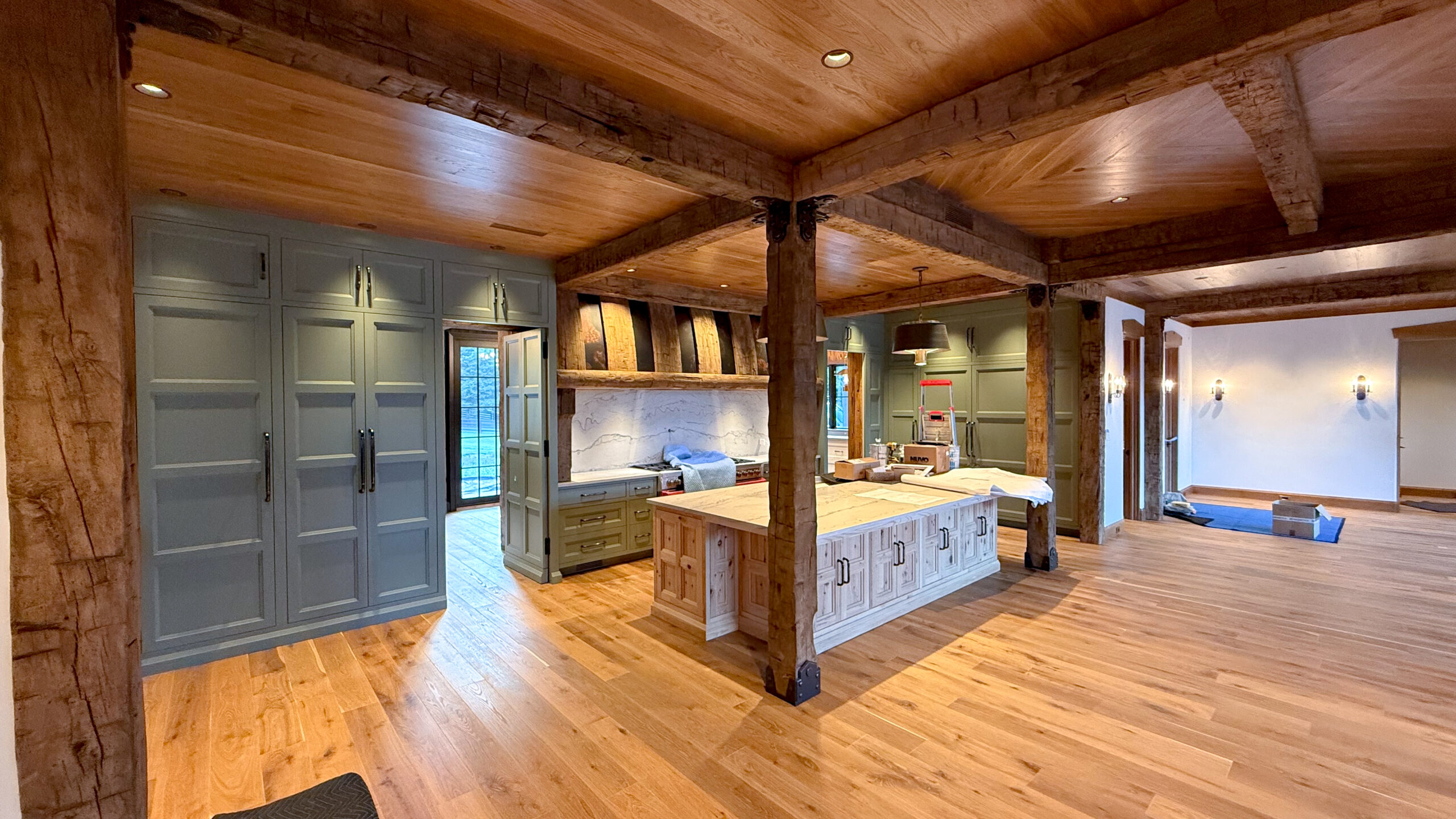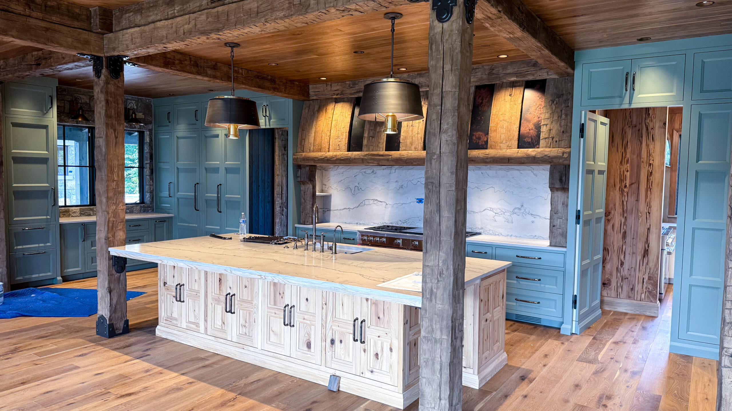 This custom kitchen blends rustic architectural beams with modern cabinetry and an oversized island. The design features rich wood tones, shaker-style detailing, and a marble backsplash that enhances the natural textures of the space.
